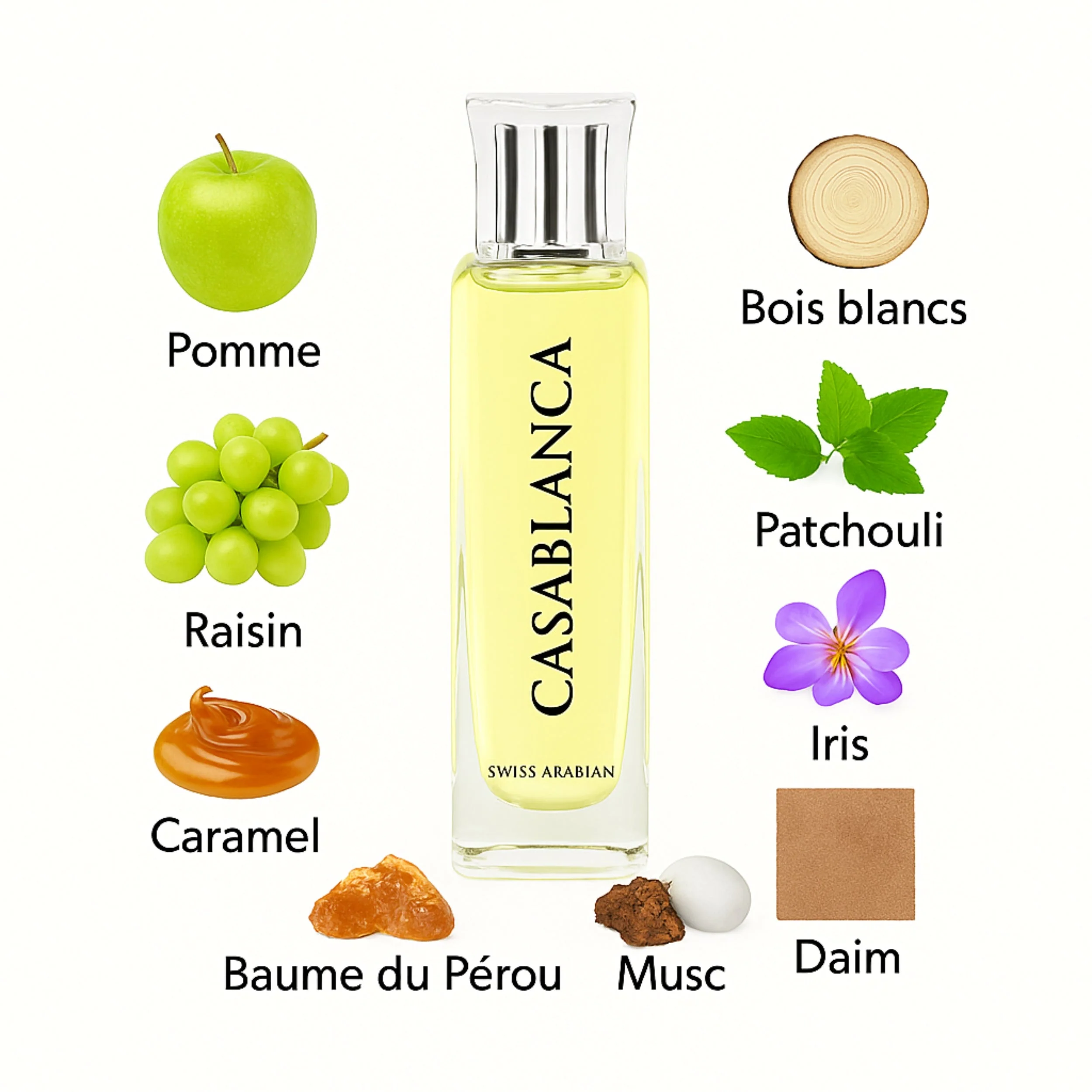 Casablanca Eau de Parfum – 100 ml par Swiss Arabian est une fragrance orientale et gourmande, unisexe, qui incarne l’élégance et le mystère des nuits dorées d’Orient. Riche et sensuelle, cette composition évoque un voyage raffiné au cœur d’un souk luxueux, entre effluves sucrées et bois précieux.